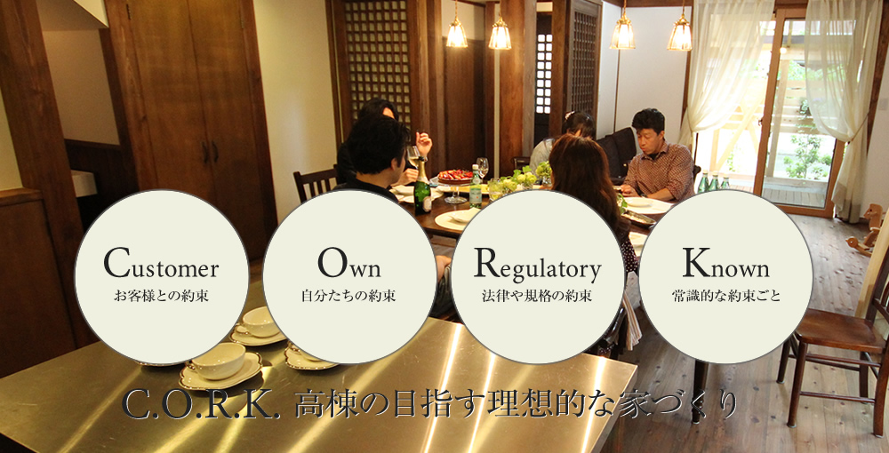 これらを、ISOの世界では称して 《C.O.R.K.(コルク)》 と呼んでいます。 そして「この4つの約束(コルク)をきちんと守ったことを、誰に対しても証明できるように「記録」を残しなさい」ともこの規格は教えています。高棟建設では、このC.O.R.K.(コルク)を経営理念とし、日々実践しています。