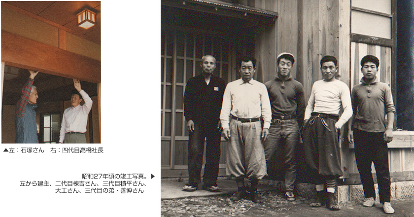 明治30年創業の高棟建設工業。「ヒョウさん」の愛称で親しまれた、初代・高橋兵吉さんは頑固一徹の職人で、大正12年の関東大地震では近隣の傾いた家を直し歩いた。そんな仕事への誠実な姿勢は二代目棟吉さん、三代目積平さん、そして四代目正成さんへとしっかり受け継がれている。地域密着型を貫く同社。親子三代にわたって家づくりを依頼されることも少なくない。そんなお宅の一つが泉区の石塚さんで「家の事なら高棟さん。それが当たり前で、私の祖父の頃からお世話になっています」(ご主人)。初代には物置や家の修繕、二代目には棟梁として、石塚さんが持つ裏山の木を選ぶところから始めていましたね」(高橋社長)。