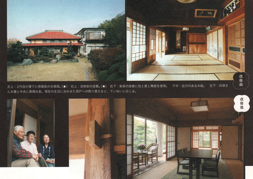 石塚邸は22年前に土地区画整備のため移転することに。やむ無く壊されるには惜しい、金物を使わず自前の木で建てた愛着の家だった。建て替えを任された三代目に、二代目は座敷の柱と差し鴨居を新居に移すようにと指示。昔の家の記憶を宿す住まいに対して「こうした物語があるからお座敷は自慢の種よね」と石塚さんの奥さん。