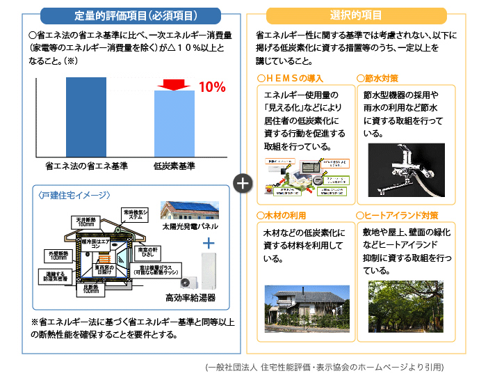 低炭素建築物として認定されるためには、外皮性能の省エネルギー基準への適合に加え、一次エネルギー消費量が省エネルギー基準よりも10%削減できること、低炭素化対策を採用していることが要件となります。