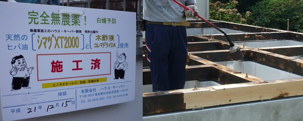 またリフォーム等で、防蟻処理を行わなければならない場合は、無農薬自然素材の木酢(もくさく)液・ヒバ油・ヒバ水を使用します。人(特に妊婦さんや乳児)やペットに害の考えられる農薬は一切使わず、大切な建物をシロアリから守ります。(保証は農薬と同じ5年間となります)