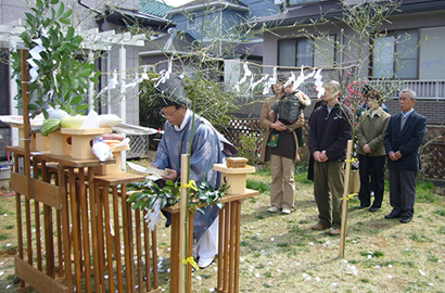 地鎮祭とは、「コトシズメノマツリ」と読み建築工事に先立ちその土地の神を祭って工事の安全を祈願する儀式です。祭神は産土神(ウブスナノオオカミ)、大地主神(オオトコヌシノオオカミ)で、出産の守り神、大地を意味する神となっています。大地をけがする事に対して許しを乞い、地のけがれを鎮めるわけですが、昔は建物の中心と 北東、南西、西南、西北の四隅に人形や鉾、玉、銭などを埋めていました。