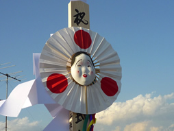 鎌倉時代に大報恩寺の本堂(釈迦堂)を作った大工の棟梁(高次)は、大事な柱の寸法を間違い短く切ってしまいました。そのことを知った妻のおかめ(阿亀)が枡組を使うようにアドバイスし、高次は無事に本堂建築の大任を果たすことができました。しかし、おかめは女のアドバイスで棟梁が仕事を完成させたことを知られてはいけないと本堂の上棟式を待たずに自害してしまいました。高次は上棟の日、妻おかめの冥福とお堂の無事を祈っておかめの面を御幣につけて飾ったと言われています。