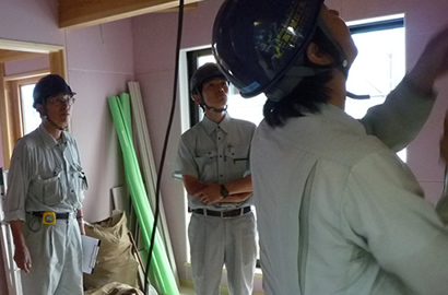 社内検査は『基礎』『上棟』『中間』『木工事完了』『完成』と基本5回、検査員は社員全員で確認します。検査後はその結果を持ち帰って社内会議を行い、即改善が必要な場合はアクションを起こします。また、良かった点や改善点を討議、社員の現場管理能力のレベルアップを図ると共に大切な社員教育の場でもあります。
