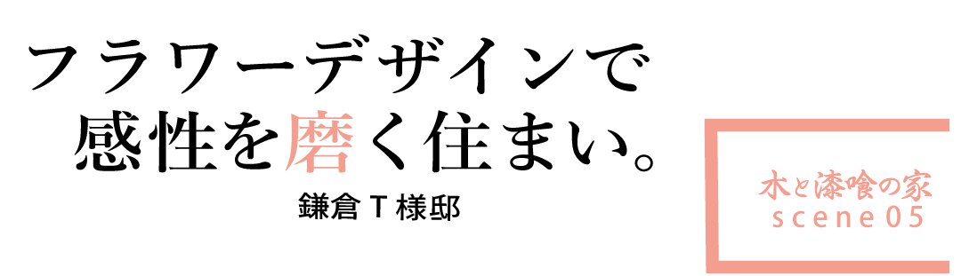 住まいと木々とのバランスは、外観だけにとどまらない。フラワーデザインのクリエイティブ性を活かすのも、 無垢の木の柱と漆喰の壁。部屋の内装はいたってシンプル。内装の色は、天然無垢の 木の色と漆喰の白だけ。漆喰の白が、まるでフラワーデザインのキャンバスかのよう。シンプルな設計がフラワーデザインを活かし、住まいの季節感と 愉しさと生み出している。