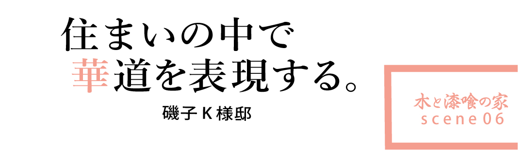 奥様は、正宝古流華道教授「宝梅庵」の先生。年間を通じて様々な花々と向き合い表現していく。先生にとって住まいは、華道教室の場であり自分自身の感性を表現する場所。特に、和室の奥の床の間は先生の感性を表現する最高の舞台。暮らしの変化を愉しめる大切な場所をつくることが大切だと思い設計をした。