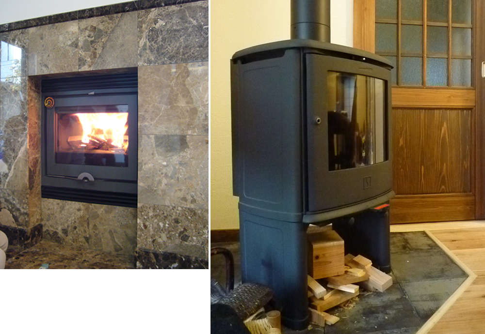 右:漆喰の壁にもお似合いの薪ストーブ。この機種は《スキャン製CI-8GLCB》。大きめなガラス窓とすっきりとしたデザインが特徴です。またこのストーブは対流熱式(コンベクション)となっていて側壁面・後壁面は空気流通層があるため、比較的高温になりにくいので壁や家具により近づけて設置できます。さらに高齢者やお子様のいらっしゃる家庭では安全性が高いというメリットもあります。