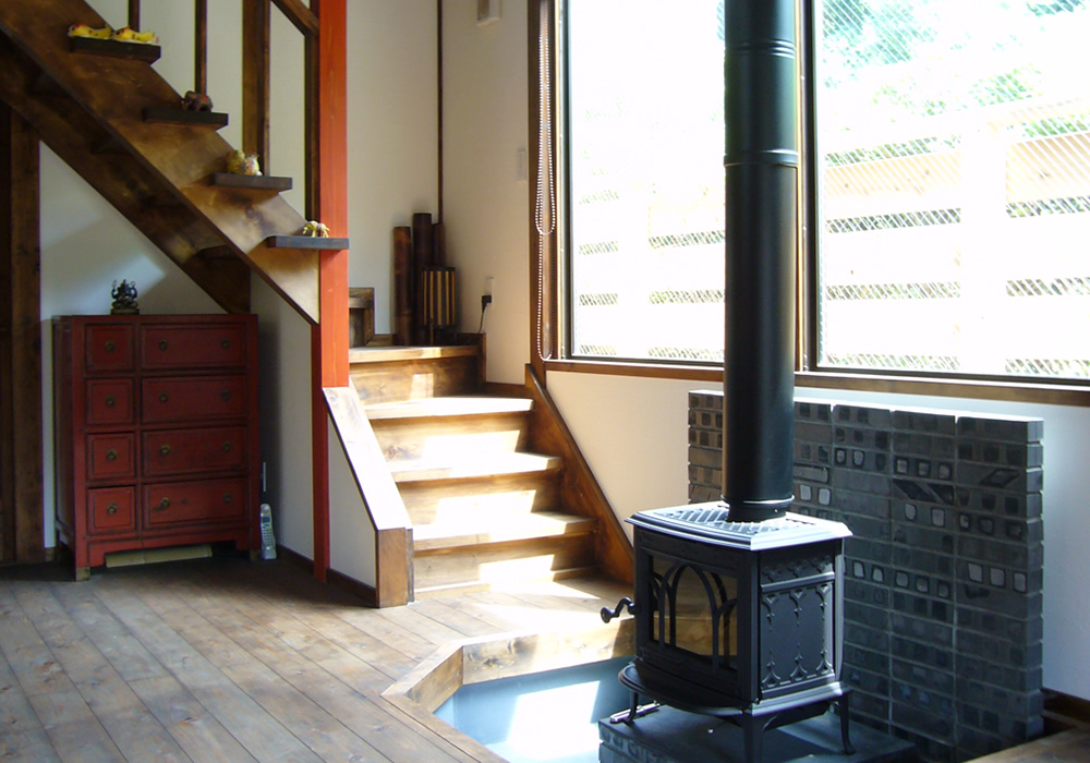 高棟建設で施工させて頂いた薪ストーブです。薪ストーブを床より一段下げた位置に設置し堀こたつのようにしてみました。機種は《ヨツール製F400》。コンパクトながら十分な暖房能力(定格出力6.9kw)を持っています。「The薪ストーブ」といえる従来からの薪ストーブらしさを保持したデザインで人気の一台。シーズンになると暖房のメインはこの薪ストーブ、当初は旦那様の強いご要望で設置しましたが、住んでからは奥様も積極的に利用し生活の中で大切なアイテムとなっています。