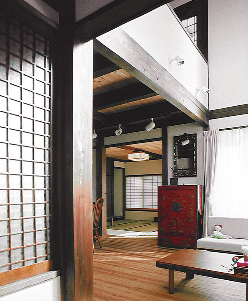左下:リビングには赤い李朝家具が置かれています。この家具を持っていたことで【木と漆喰の家】に決めたのだとか・・・。