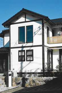 モルタル吹付けの外壁に《付け土台》《付け柱》《付け同差し》でデコレーションしました。高棟建設が基本的に使っている構造材は和歌山県の山長商店さんの材を使用していますが、このお宅はご夫婦とも宮城県の出身との事で宮城県のくりこま産の木材でくんえん乾燥させたものを使いました。