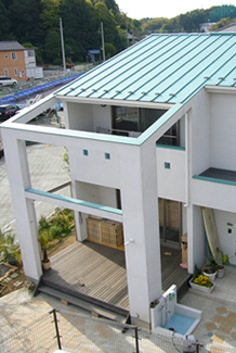 この建物の一番の特徴となる《制震パネル》。外壁側の適切な場所に金属板とブチルゴムでつくられた制震パネルを装着しています。出来上がりはこんな感じでいたって普通の外壁です。大地震の際はこのパネルが地震力を吸収するのですが、建物の崩壊を出来るだけ少なくすることを目的にしているため、壁にダメージが生じる事は想定されます。