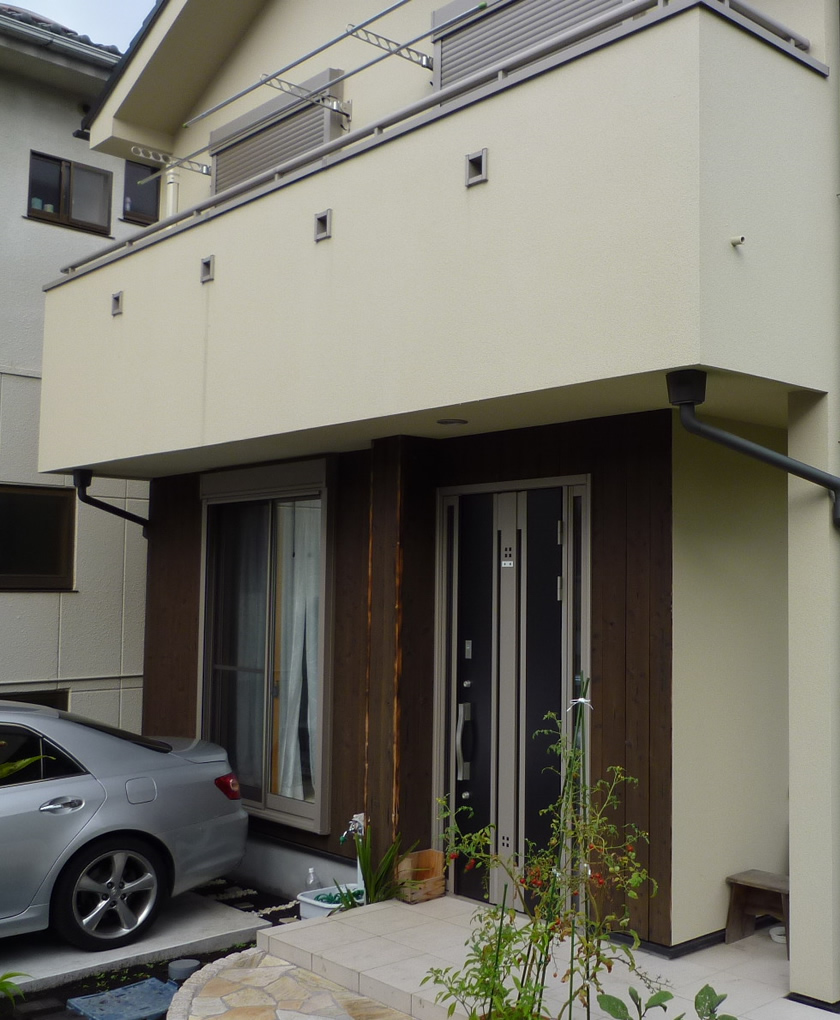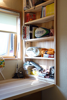 右:【木と漆喰の家】は木材の色と漆喰の白い壁とで成り立っているのでカラーコーディネートはほとんどありません。ですので、このようなちょっと派手と思えるデザインもはまってしまうのです。大胆な色使い大賛成です!