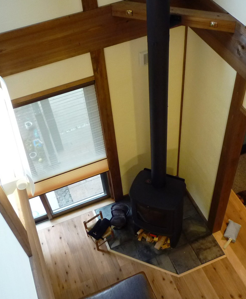 リビングに吹き抜けと薪ストーブ、高棟建設の定番(?)。柱や梁を古色に仕上げた鎌倉の家を演出してみました。
